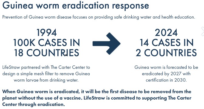LifeStraw was born as an effort to eradicate Guinea worm disease in partnership with The Carter Centre. For over 25 years, LifeStraw continued to work on Guinea worm eradication alongside tackling humanitarian crises to disaster and emergency response work actively supporting access to safe water across the globe. This history and depth of expertise resulted in high performance water filter products you can trust with your life.