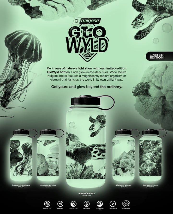 Be in awe of nature’s light show with the Nalgene limited-edition Glo Wyld bottles. Each glow-in-the-dark 1L Wide Mouth Nalgene bottle features a magnificently radiant organism or element that lights up the world in its own brilliant way. Choose from GLO WYLD Black Turtle, Black Jellyfish, Black Mushrooms, Black Worms and Black Crystals